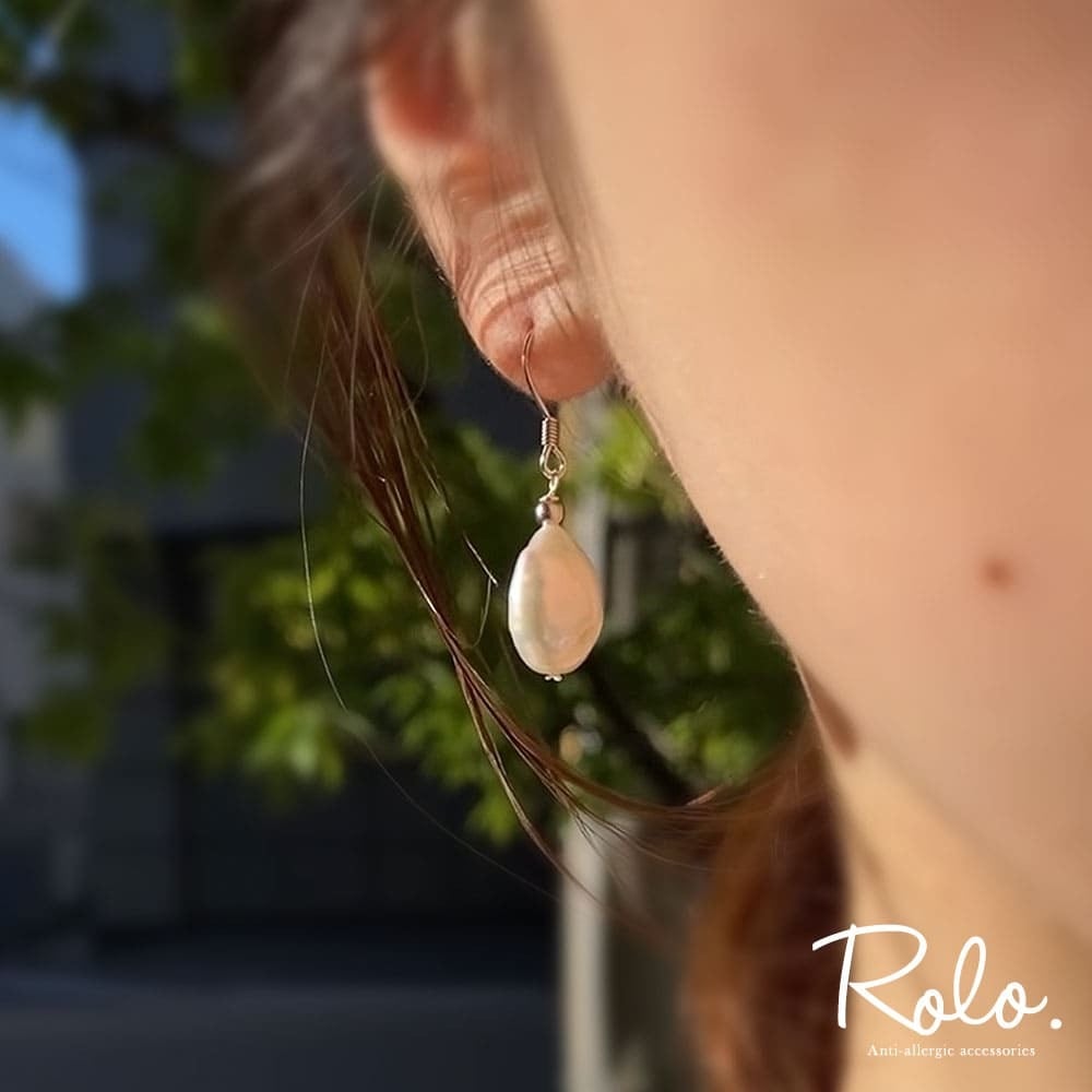 まんまるパールより力が抜けた雰囲気で、日常のコーデにも馴染みやすい。カジュアルからフォーマルまで幅広く合わせられます。