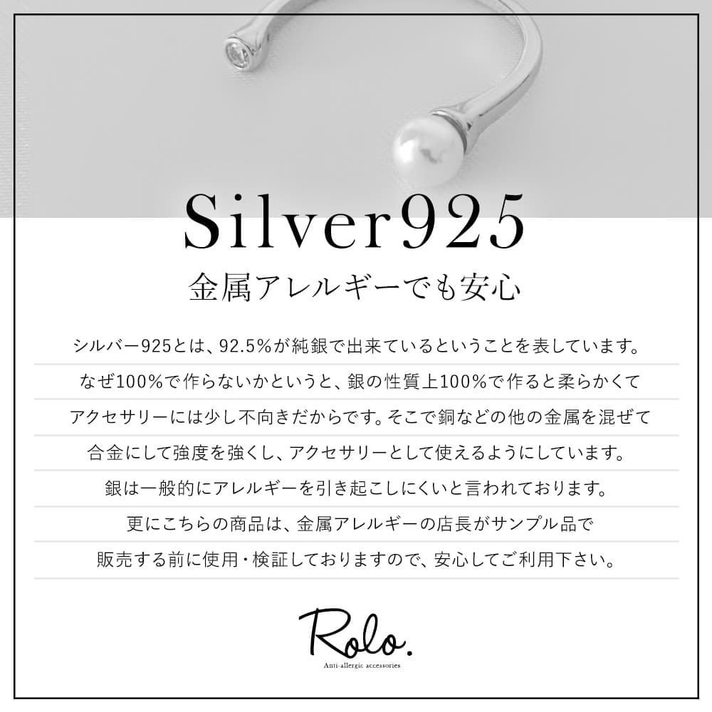 シルバー925 とは、92.5%が純銀で出来ていることを指します。銀は金属アレルギーになりにくい素材で、とても柔らかい金属のため残り7.5%に主に銅を使うことでアクセサリーとして使えるよう硬くしています。