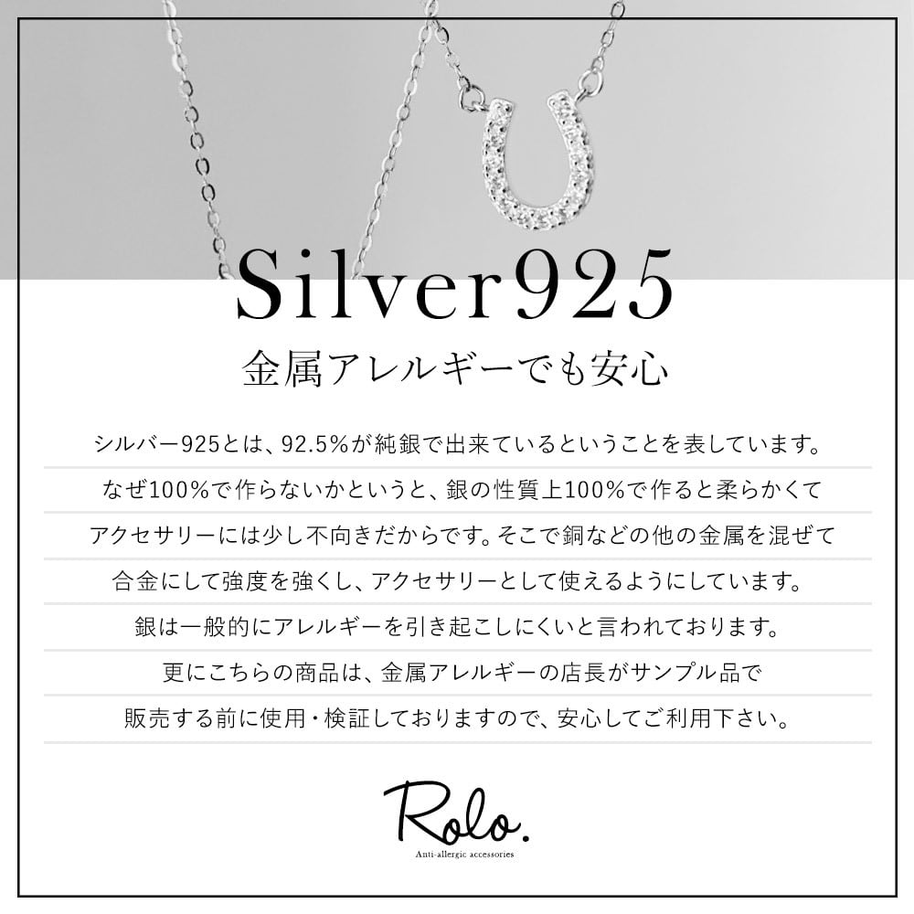 シルバー925 とは、92.5%が純銀で出来ていることを指します。銀は金属アレルギーになりにくい素材で、とても柔らかい金属のため残り7.5%に主に銅を使うことでアクセサリーとして使えるよう硬くしています。