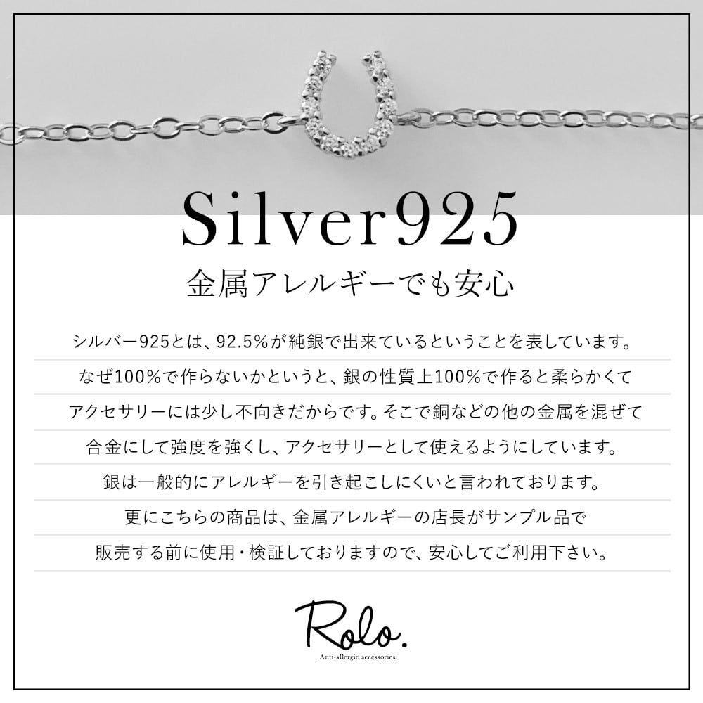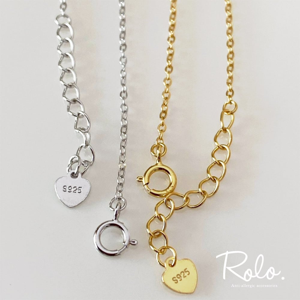 シルバー925 とは、92.5%が純銀で出来ていることを指します。銀は金属アレルギーになりにくい素材で、とても柔らかい金属のため残り7.5%に主に銅を使うことでアクセサリーとして使えるよう硬くしています。