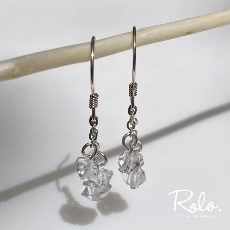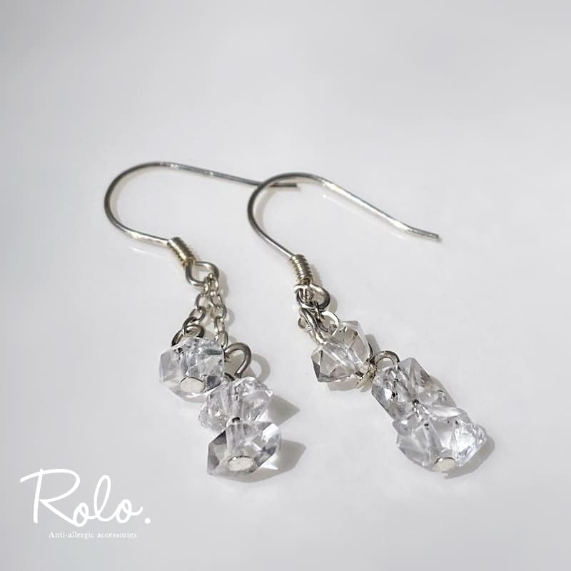 ハーキマーダイヤが静かに揺れる、3粒フックピアスです。