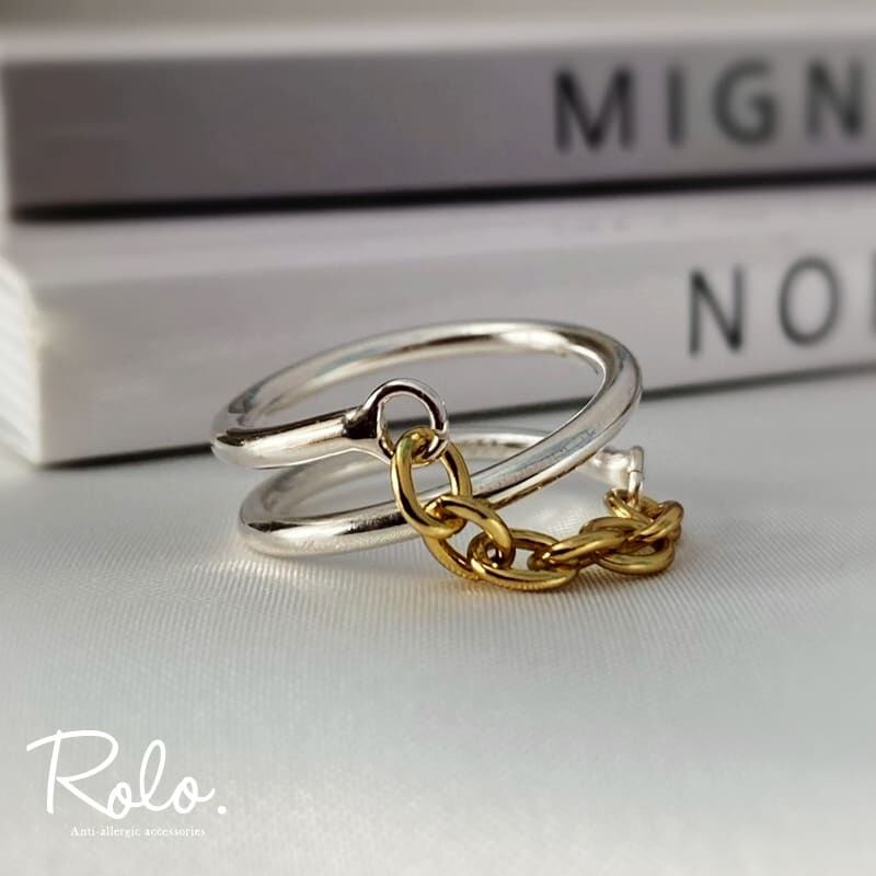 ループ状アームに繊細なチェーンをクロスさせたデザインは、カジュアルにもきれいめなコーディネートにも活躍する、好バランスなリングです。
