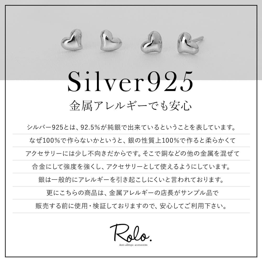 シルバー925 とは、92.5%が純銀で出来ていることを指します。銀は金属アレルギーになりにくい素材で、とても柔らかい金属のため残り7.5%に主に銅を使うことでアクセサリーとして使えるよう硬くしています。