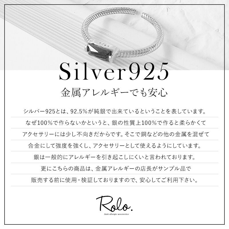 シルバー925 とは、92.5%が純銀で出来ていることを指します。銀は金属アレルギーになりにくい素材で、とても柔らかい金属のため残り7.5%に主に銅を使うことでアクセサリーとして使えるよう硬くしています。